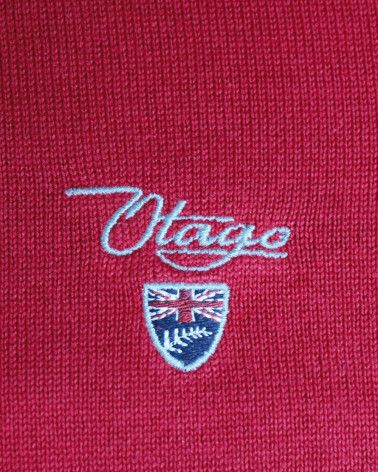 Doudoune Besty Otago rugby bleu marine homme 2 bandes horizontales bordeaux et gris clair Ecusson en cuir et métal imprimé sur la manche...