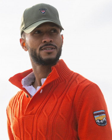 Pull torsadé Cardrona Otago rugby orange pour homme porté